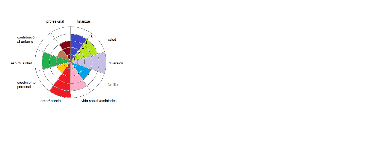 Como podrás observar hay en cada triangulo formado los números del 1-5, te invito a que colorees en que numero consideras que estás parado en este momento... Por ejemplo: Si necesitas mejorar tus finanzas urgentemente coloreas del centro al número 1 en el area de las Finanzas, o bien si tienes una excelente relación familiar, entonces colorearas del 1 hasta el 5, y así sucesivamente como te encuentres en este momento de tu vida en cada área.