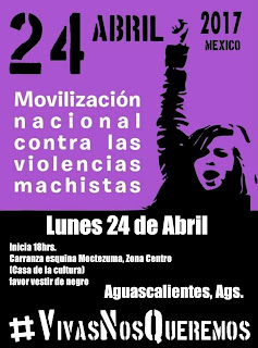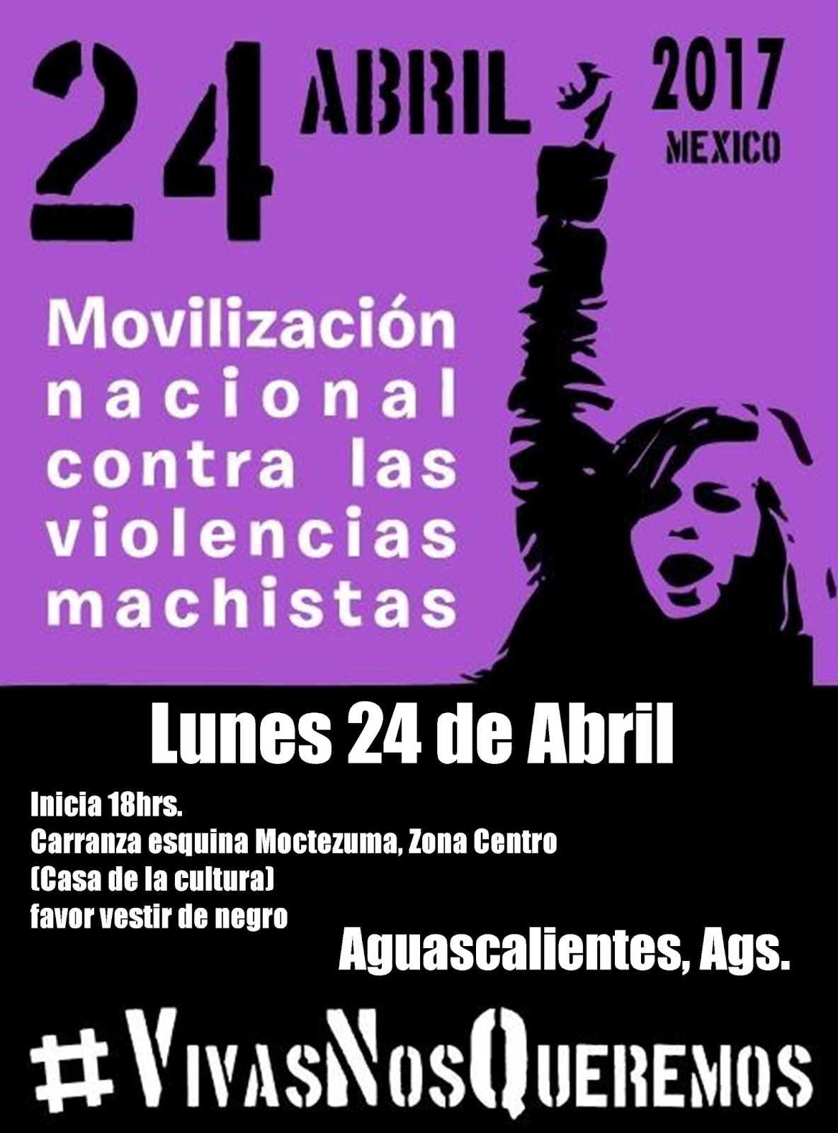 Vamos una vez más y las veces que sean necesarias, la cita es el lunes 24 de abril la procesión inicia a las 6pm, partiremos desde la Casa de la Cultura, si no viven en Aguascalientes busquen a su feminista o colectivo feminista y pregunten por la acción a realizar ese día en su estado, sí son de otro país pueden ayudarnos con la movilización digital en redes sociales usando los #VivasNosQueremos, “NiUnaMenos, #24A 2017.